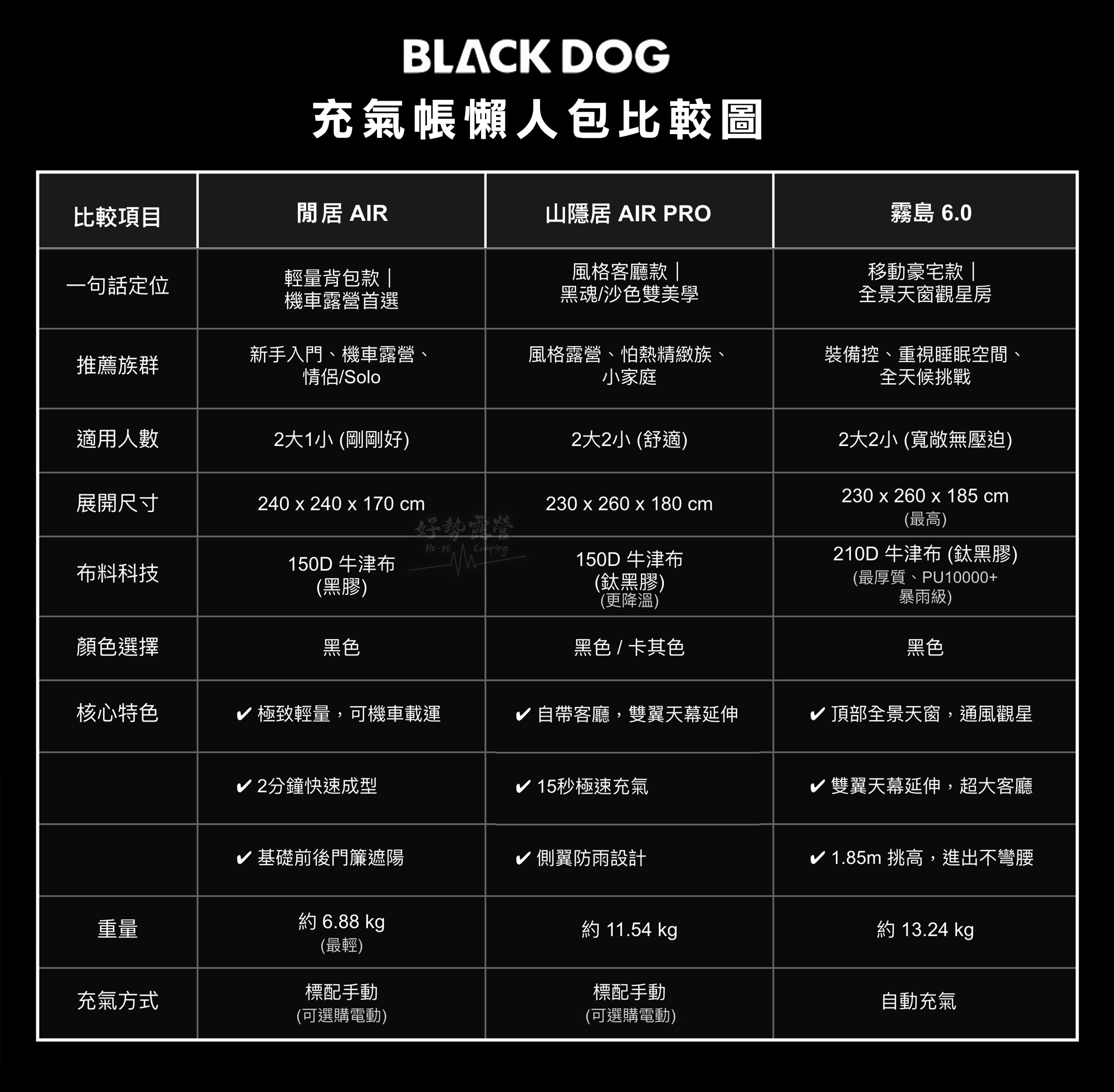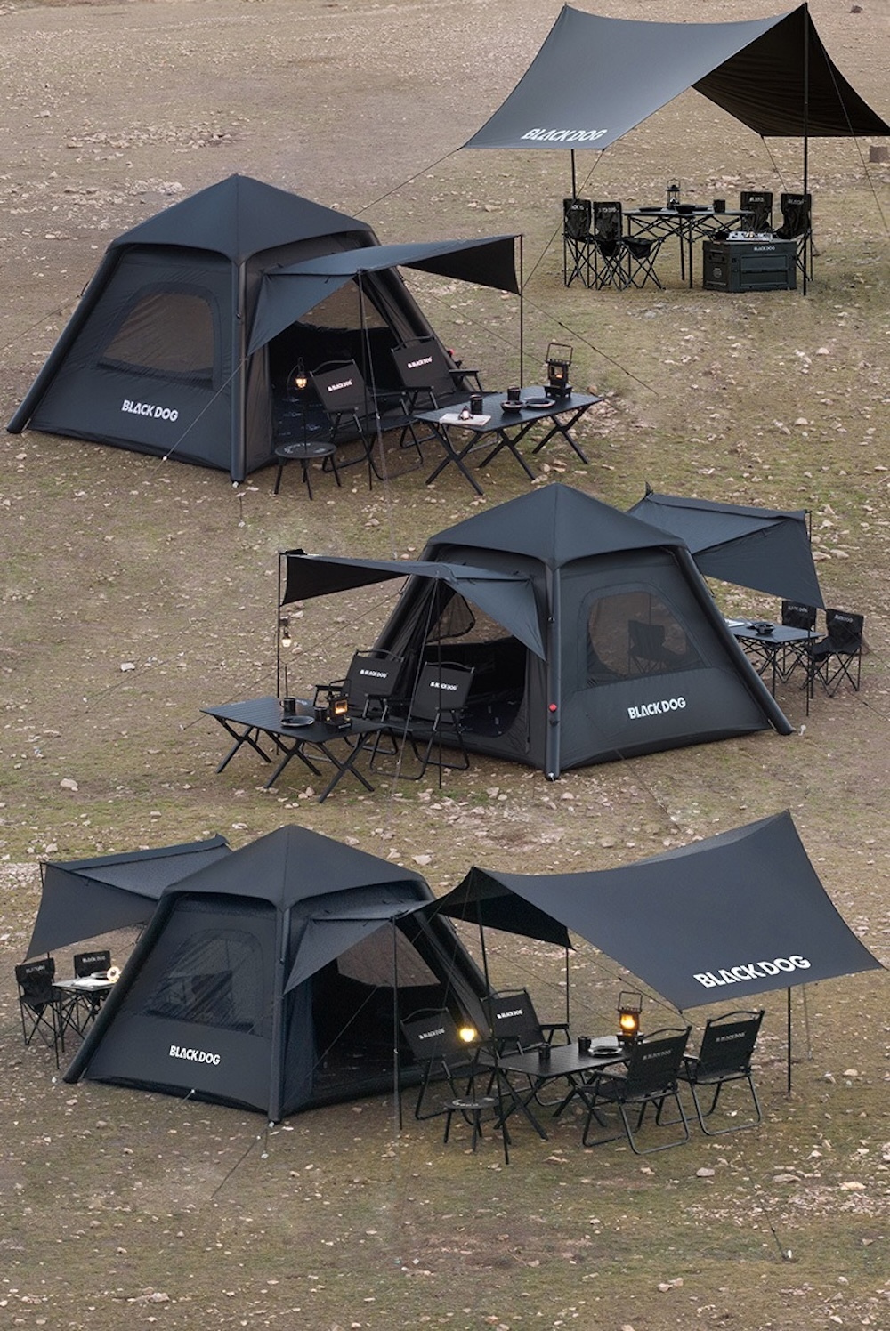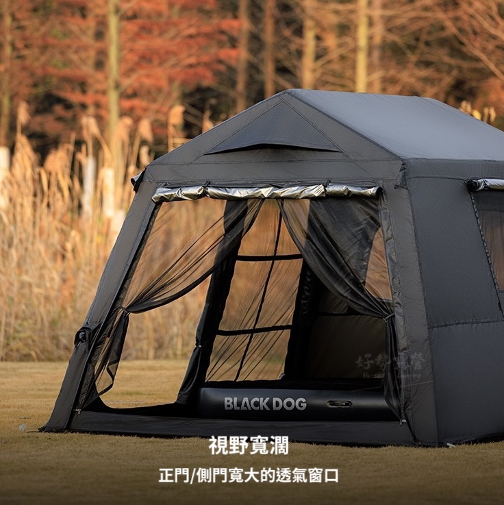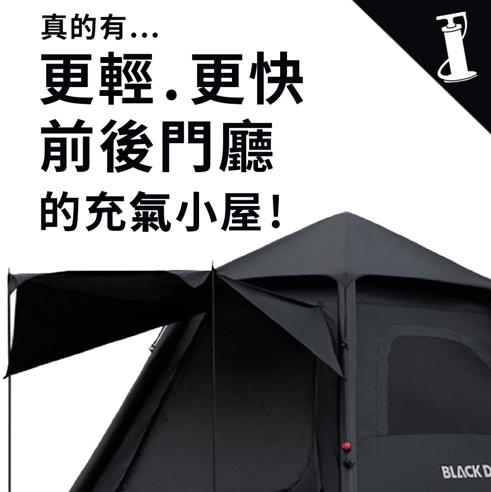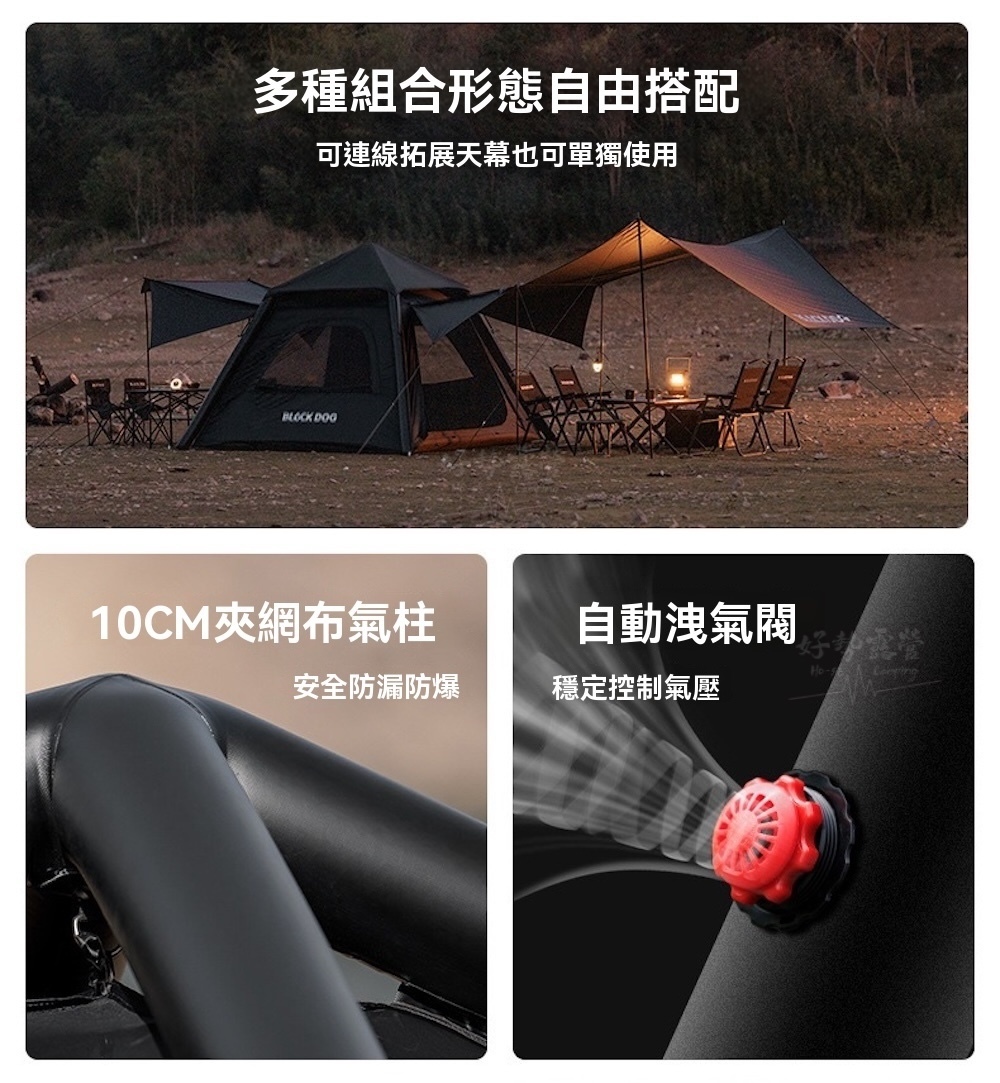 極速設營:快速充氣特性,且多了側翼防雨設計,無論想要硬派黑或溫柔沙色,都能滿足。