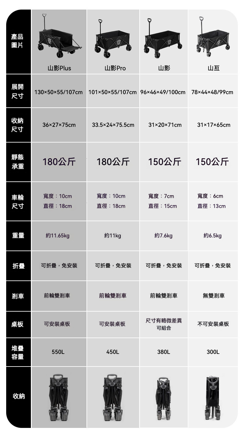 平常是輕裝露營,逛街購物使用,就選山亙,推拉更輕巧