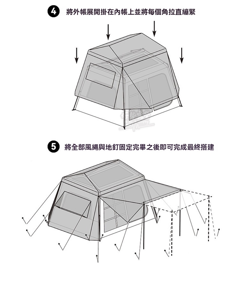 配件:收納袋1個/內帳1個/外帳1個/1.7m門廳桿2根/營繩共12根/營釘共16根/延展天幕1個