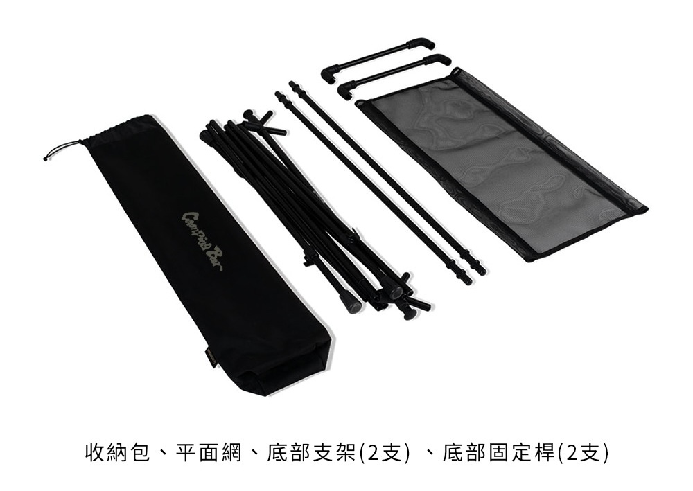 內容物:專用收納袋、主架組、橫桿、網狀收納網、快拆固定桿(2組)