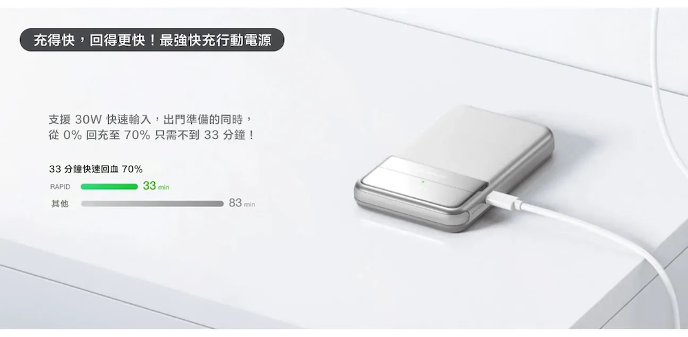 ▍閃電快充,快速補電:支援 30W 快速輸入,從 0% 充至 70% 只需 33 分鐘,準備出門時快速補電,讓你隨時滿電出發。