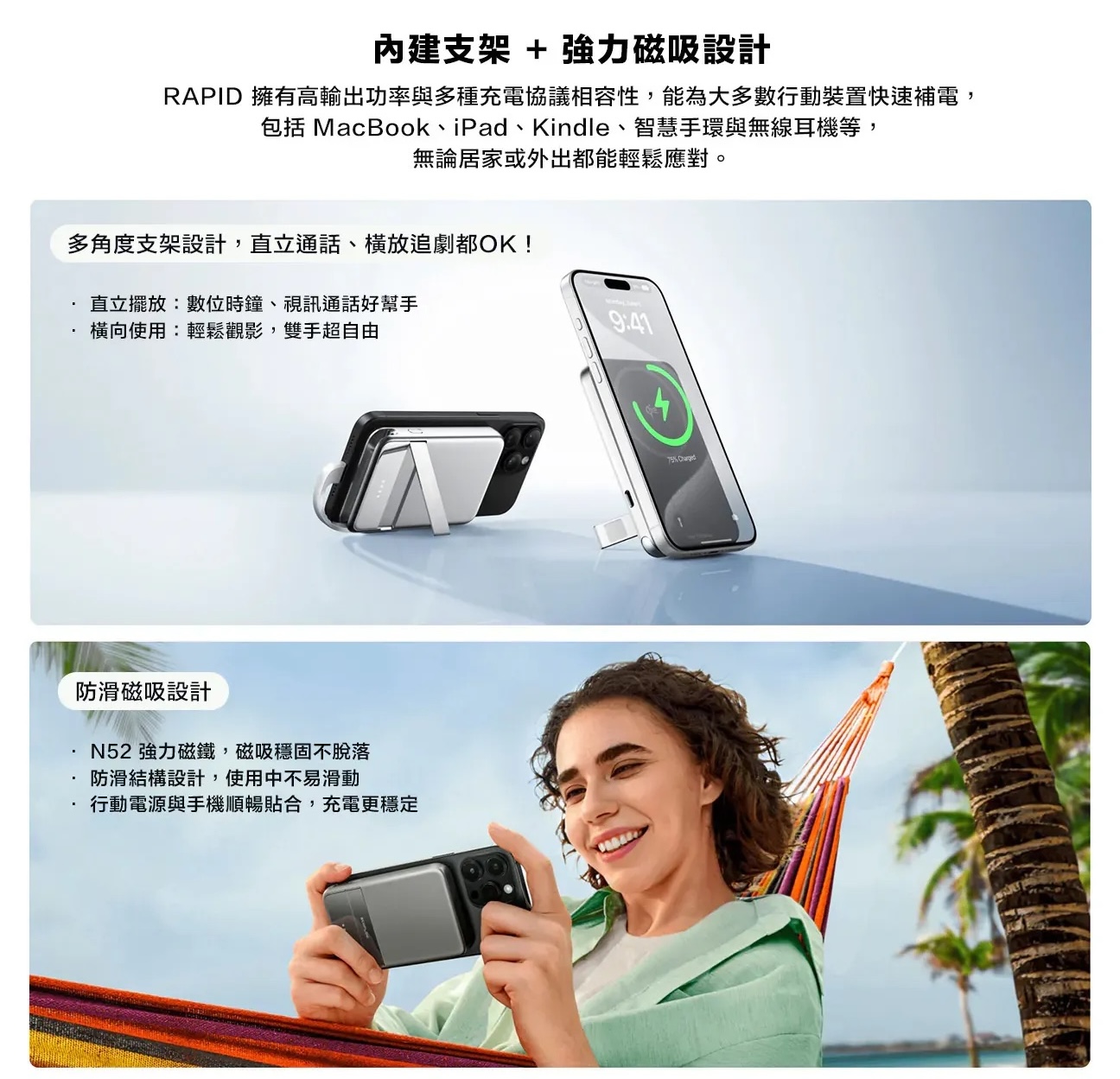 ▍內建立架,多角度使用:內建支架設計,直立或橫放都方便,桌上輕鬆追劇、視訊零手持,一機多用更實用。