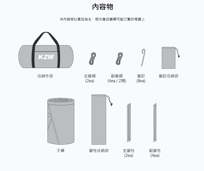 內容物 : 天幕、營釘x8ea、營繩x6ea、主獵柱x2ea、副營柱X4ea、營釘收納袋、凳柱收納袋