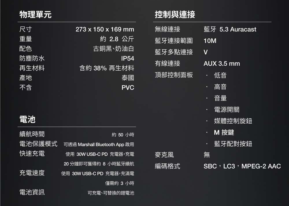 配件/內容物:Kilburn III藍牙喇叭、充電線、快速入門指南、法律與安全資訊