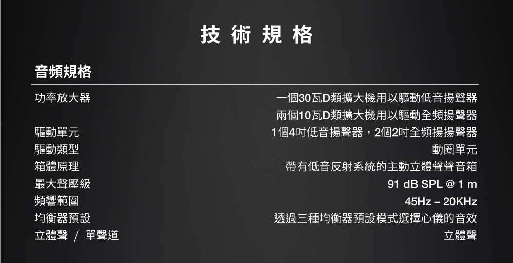 ✔ 配置4吋低音喇叭、2吋全頻驅動器,搭配30W低音及兩個10W全頻D類放大器