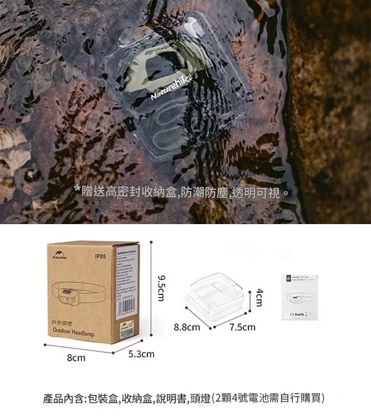 內容物:頭燈x1(需自行購買2顆4號電池搭配使用)、收納盒x1、說明書x1、包裝盒x1