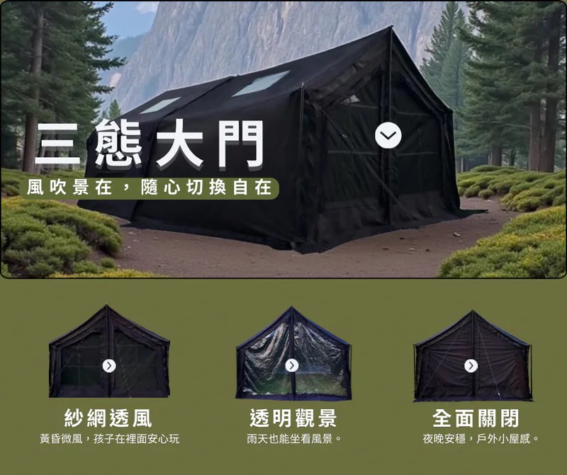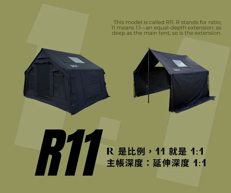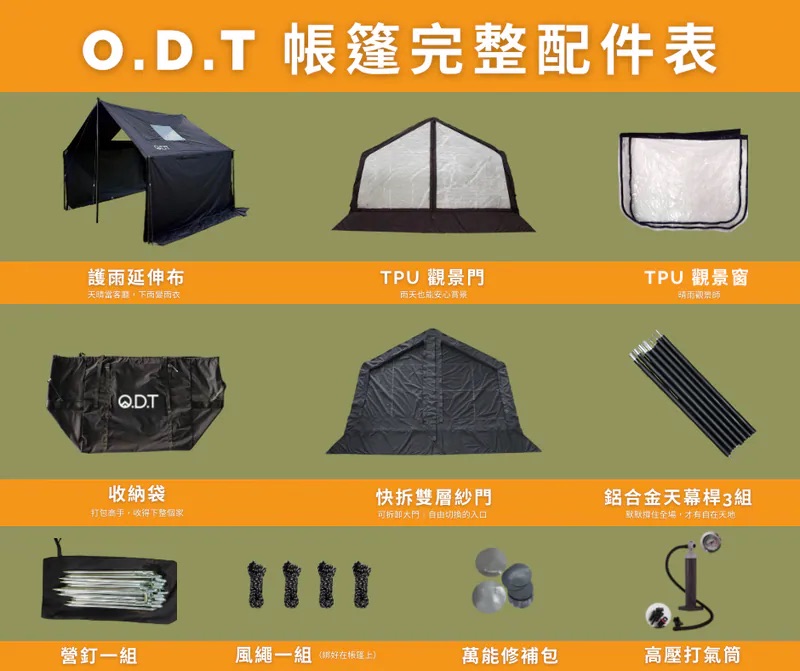 內容物:R11充氣障、護雨延伸布、TPU觀景門、TPU觀景窗、收納袋、快拆雙門紗門、