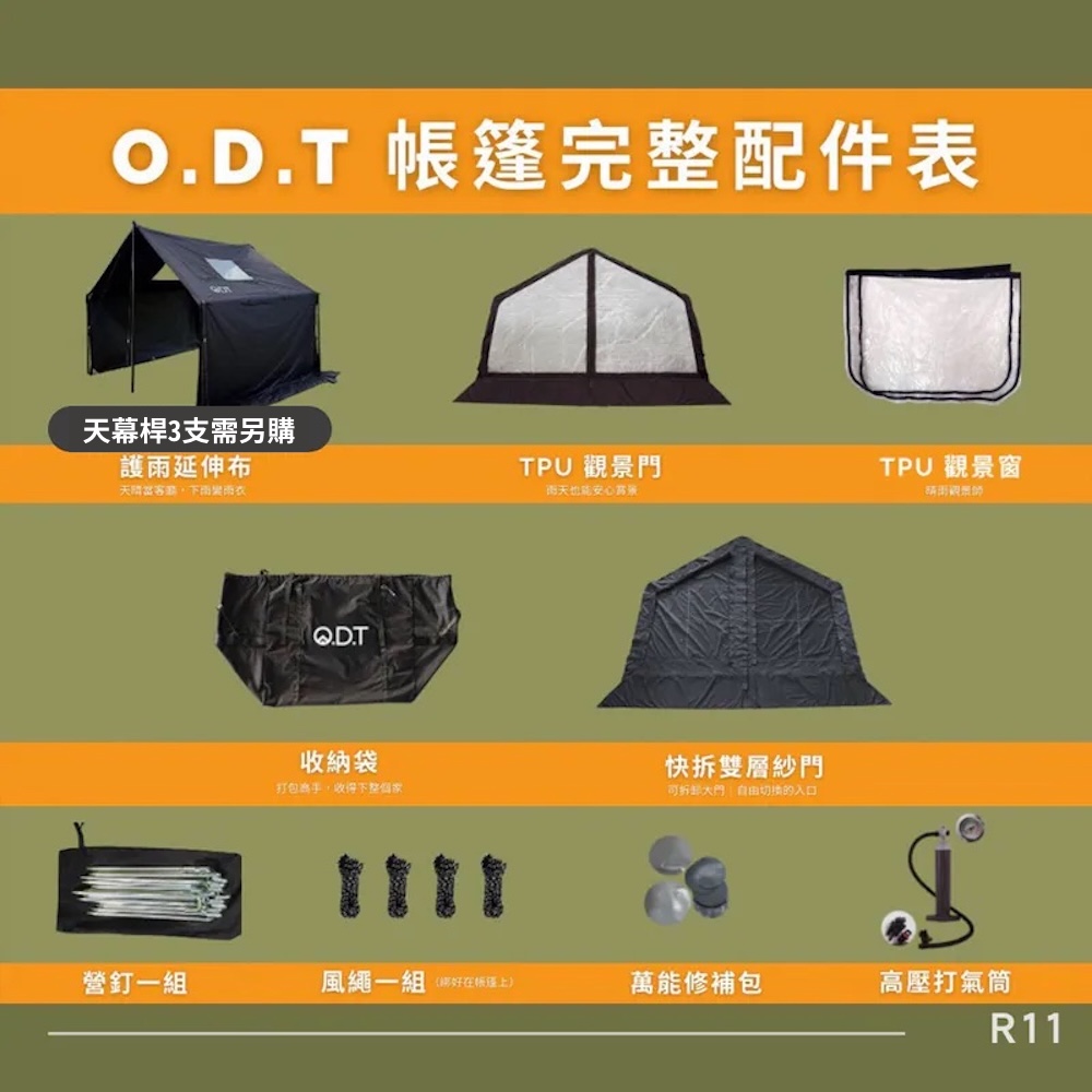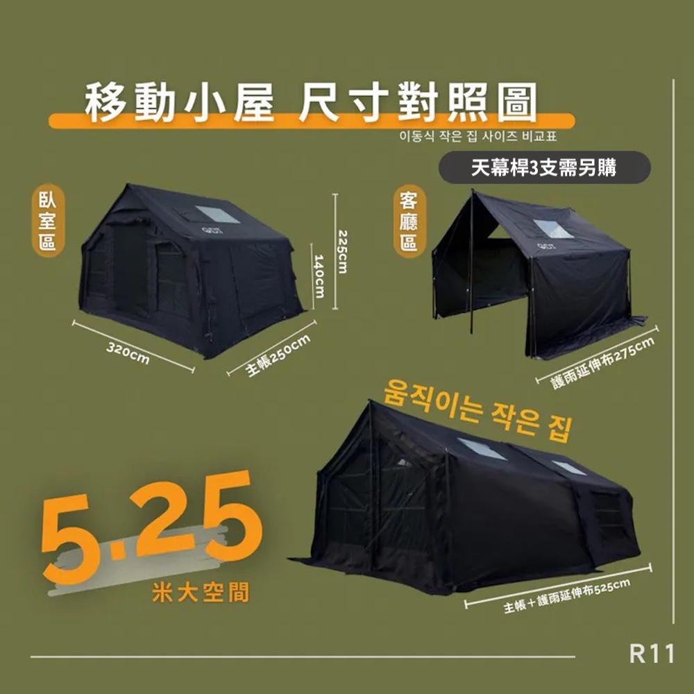 內容物:R11充氣障、護雨延伸布、TPU觀景門、TPU觀景窗、收納袋、快拆雙門紗門、營釘一組、風繩一組、萬能修補包、高壓打氣筒