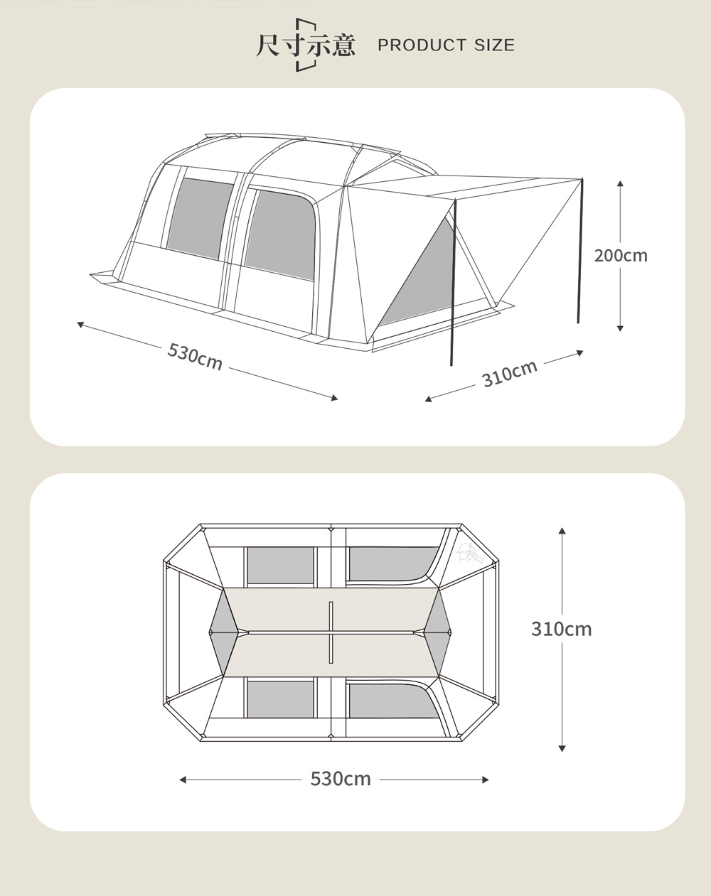 商品尺寸:頂布-約360x260cm / 外帳-約530x310x200cm / 內帳-約270x200x185cm / 前庭鋁桿-約19mmx1.7m