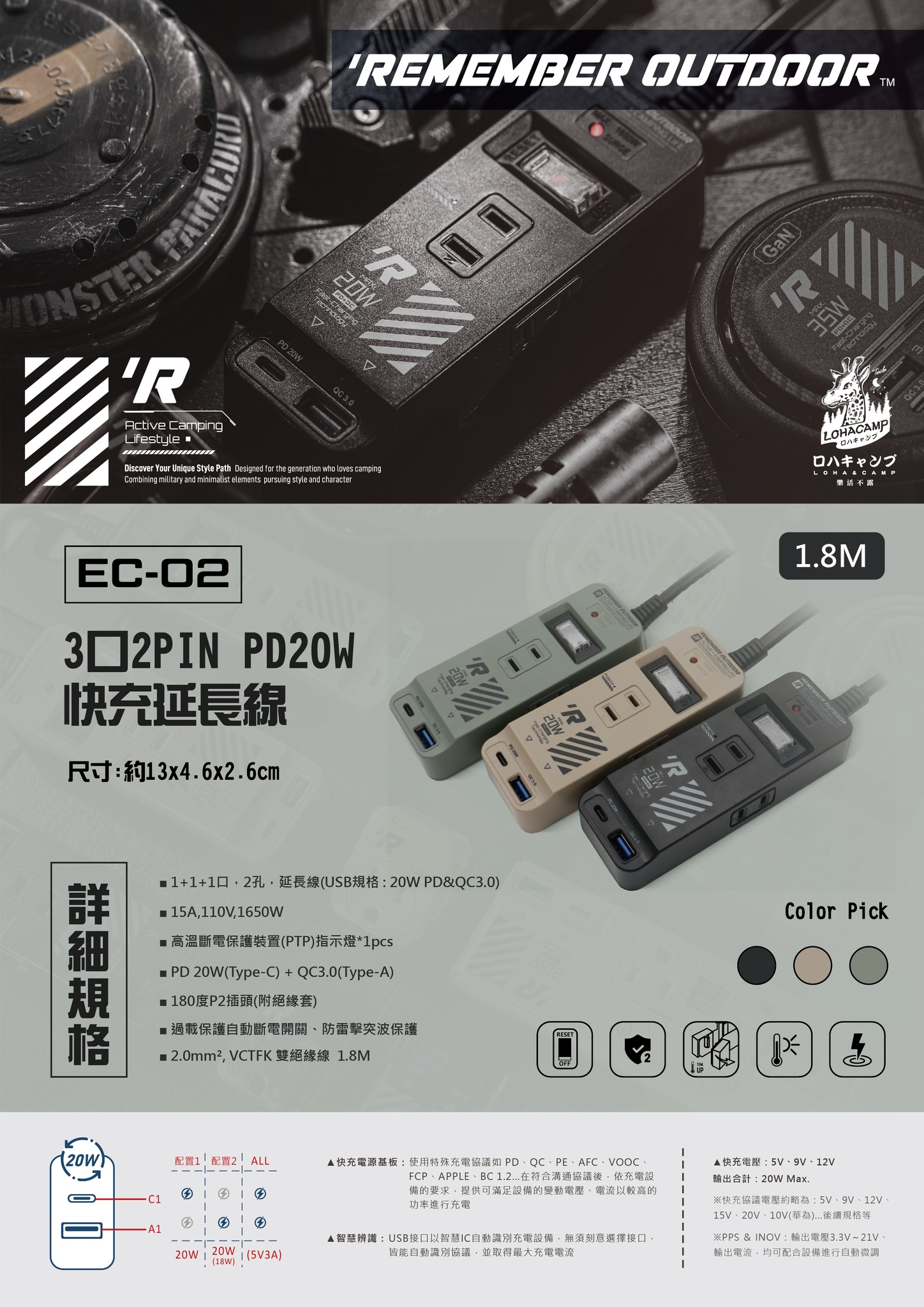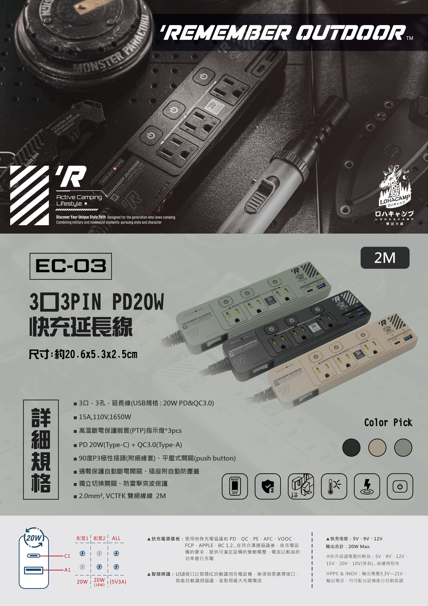 產品規格:3口、3孔、PD20W(Type-C)+QC3.0(Type-A)