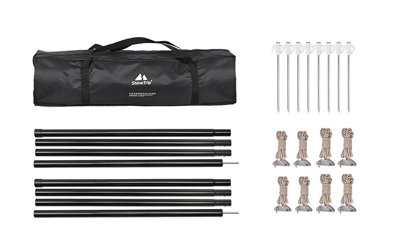 內容物:天幕支撐鐵桿*2 、收納袋*1 、地釘*8 、防風營繩*8(4.5m*4條+3m*4條)