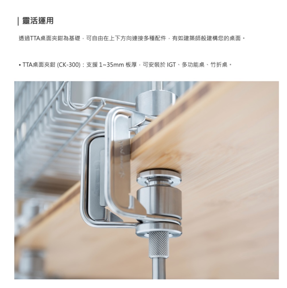 透過 TTA 桌面夾鉗為核心基礎,可靈活擴充多種配件