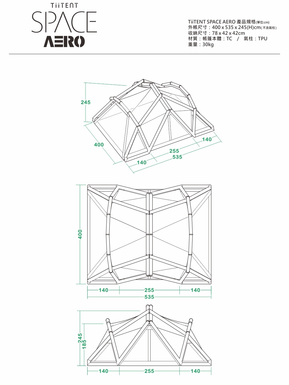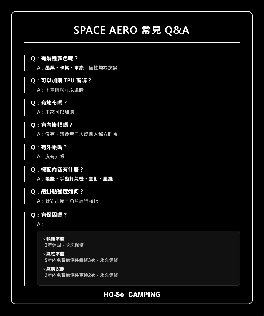 關於SPACE AERO的常見 Q&AQ:有幾種顏色呢?A:墨黑、卡其、軍綠,氣柱均為灰黑Q:可以加購TPU窗嗎?A:下單時就可以選購Q:有地布嗎?A:未來可以加購Q:有內掛帳嗎?A:沒有,請參考二人或四人獨立睡帳Q:有外帳嗎?A:沒有外帳Q:標配內容有什麼?A:帳篷、手動打氣機、營釘、風繩Q:吊掛點強度如何?A:針對吊掛三角片進行強化Q:有保固嗎?A:~帳篷本體 2年保固,永久保修 ~氣柱本體 5年內免費無條件維修3次,永久保修 ~氣嘴脫膠 2年內免費無條件更換2次,永久保修