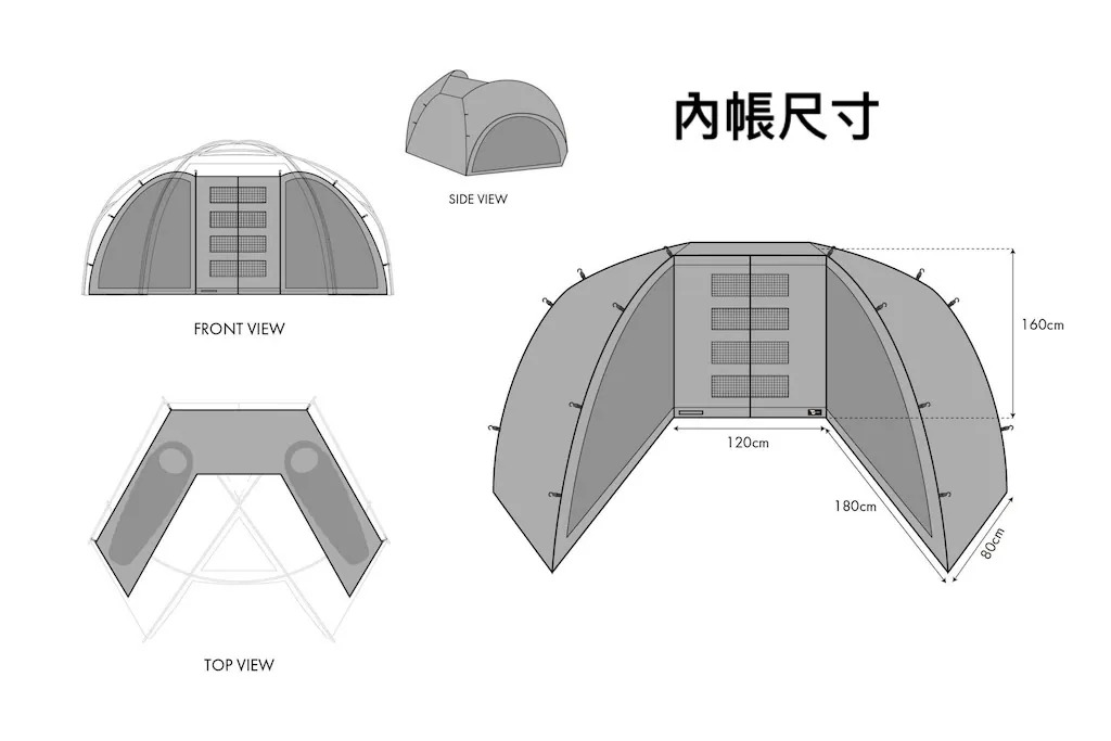• ※ 僅帳篷本體與營柱:約 10kg(不含屋頂、營釘、營繩與收納袋)
