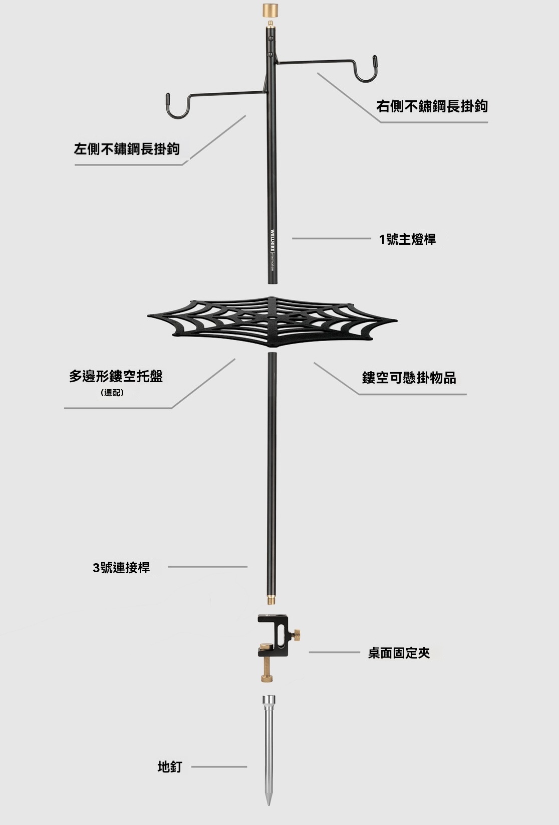 內容物:主燈桿*1個,連接桿*3個,地釘*1個,復古銅色桌夾*1個