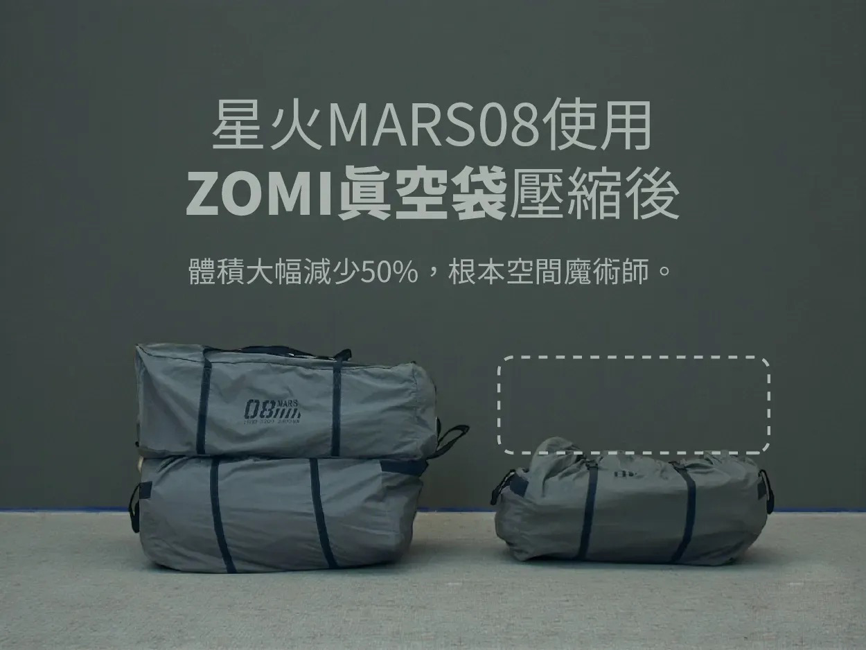 ✔ 收納帳篷時,請先將帳篷捲好並綁緊綁帶,直接放入 ZOMI TentVac 真空壓縮袋抽真空。